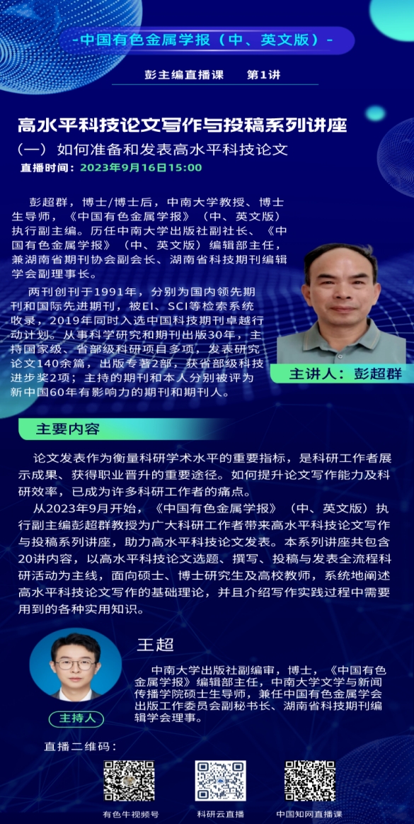 论文发表作为衡量科研学术水平的重要指标,是科研工作者展示成果、获得职业晋升的重要途径。如何提升论文写作能力及科研效率,已成为许多科研工作者的痛点。从2023年9月开始,《中国有色金属学报》(中、英文版)执行副主编彭超群教授为广大科研工作者带来高水平科技论文写作与投稿系列讲座,助力高水平科技论文发表。本系列讲座共包含20讲内容,以高水平科技论文选题、撰写、投稿与发表全流程科研活动为主线,面向硕士、博士研究生及高校教师,系统地阐述高水平科技论文写作的基础理论,并且介绍写作实践过程中需要用到的各种实用知识。