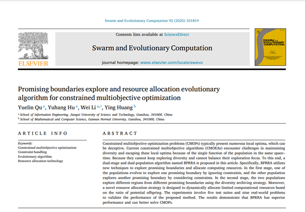 近日,计算智能实验室李伟老师指导的学术论文《Promising boundaries explore and resource allocation evolutionary algorithm for constrained multiobjective optimization》在国际权威期刊《Swarm and Evolutionary Computation》上发表。该研究成果提出了一种名为BPRRA的双阶段双种群算法,能够有效求解约束多目标问题。