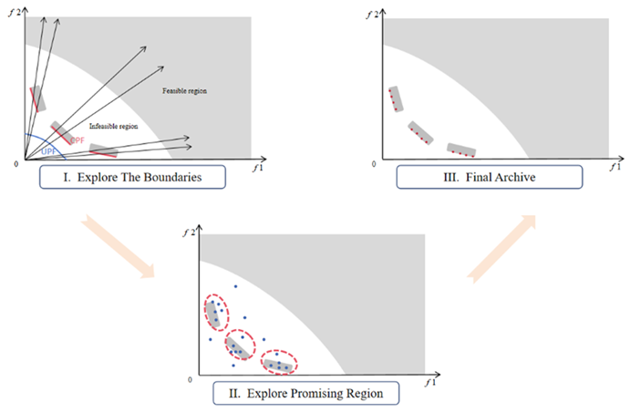 1.提出了一种新的有希望区域边界搜索策略,该策略通过双种群分别在忽略约束条件和考虑约束条件的情况下探索有希望区域的上下边界。边界信息探索过程有助于种群跨越不可行区域,通过利用潜在的不可行解来帮助种群探索约束Pareto前沿,从而提高种群的多样性和收敛性。
