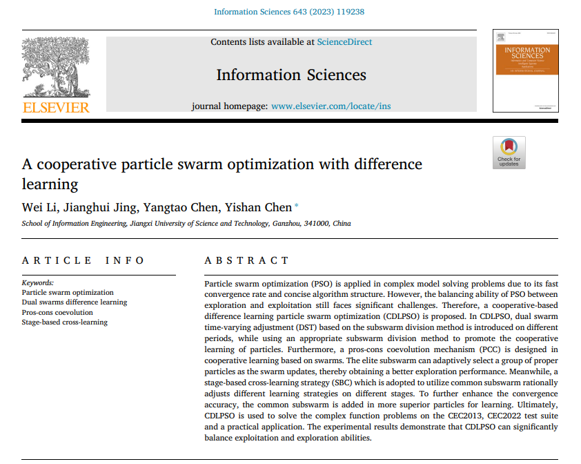 近日,计算智能实验室李伟老师指导的研究成果在《InformationSciences》上发表学术论文《A cooperative particle swarm optimization with difference learning》,提出了一种协同的差异学习粒子群优化算法。